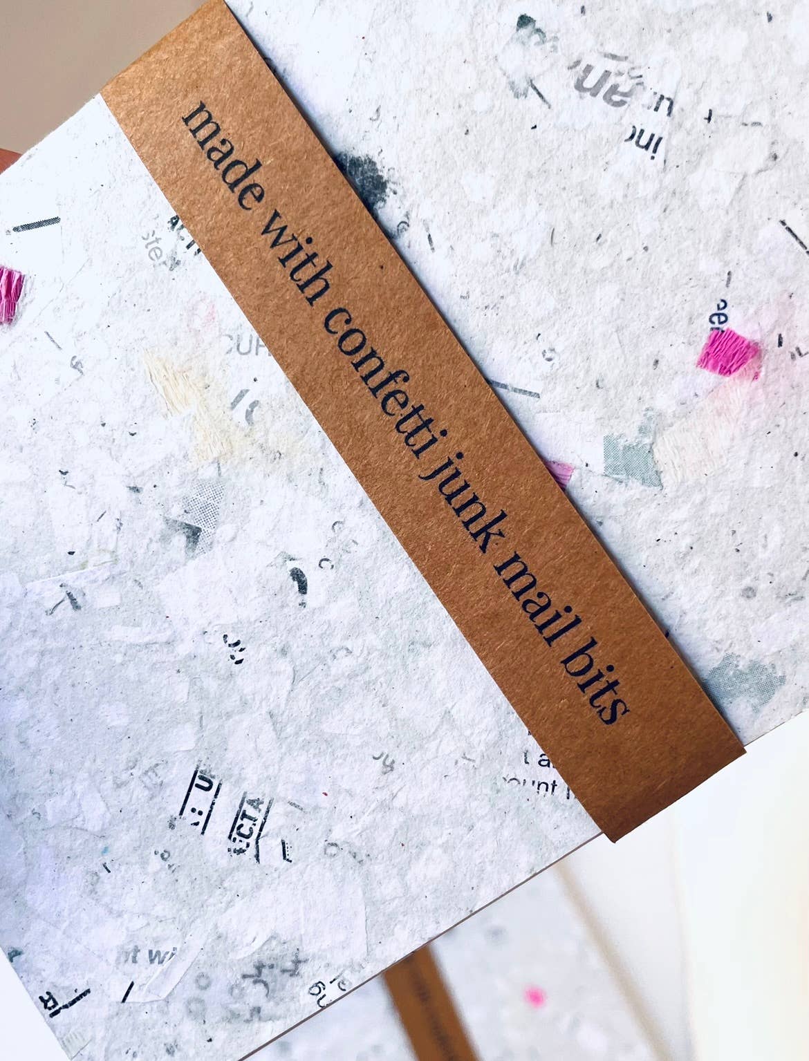 Made in partnership with a small mill in Buffalo, NY , Atelier curated a unique selection of collected junk mail and confetti, mixed it with post consumer recycled paper to make each sheet unique.